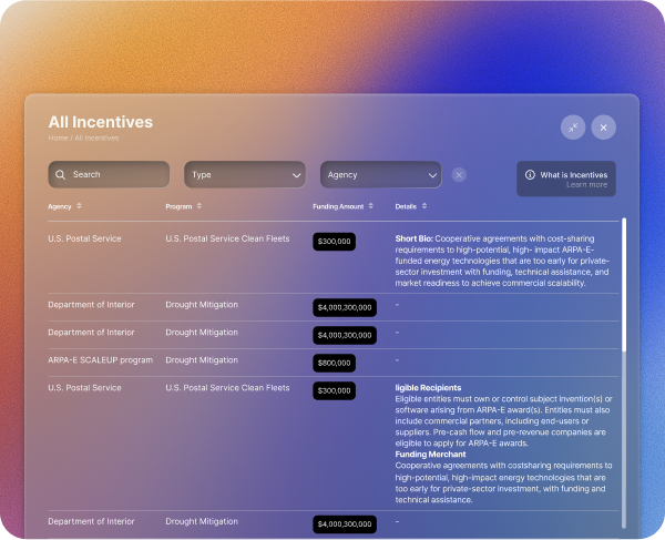 Incentives is a searchable database that helps consultants and organizations discover thousands of government-backed climate and energy financial incentives — unlocking funding to make projects more affordable and impactful.